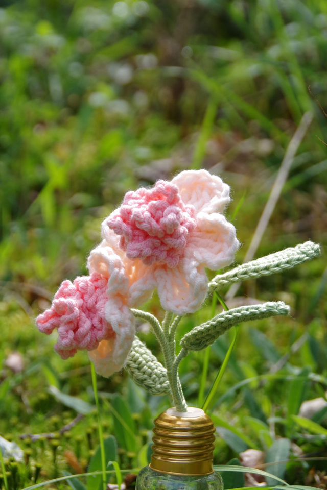 Fleurs roses dans leur vase ampoule